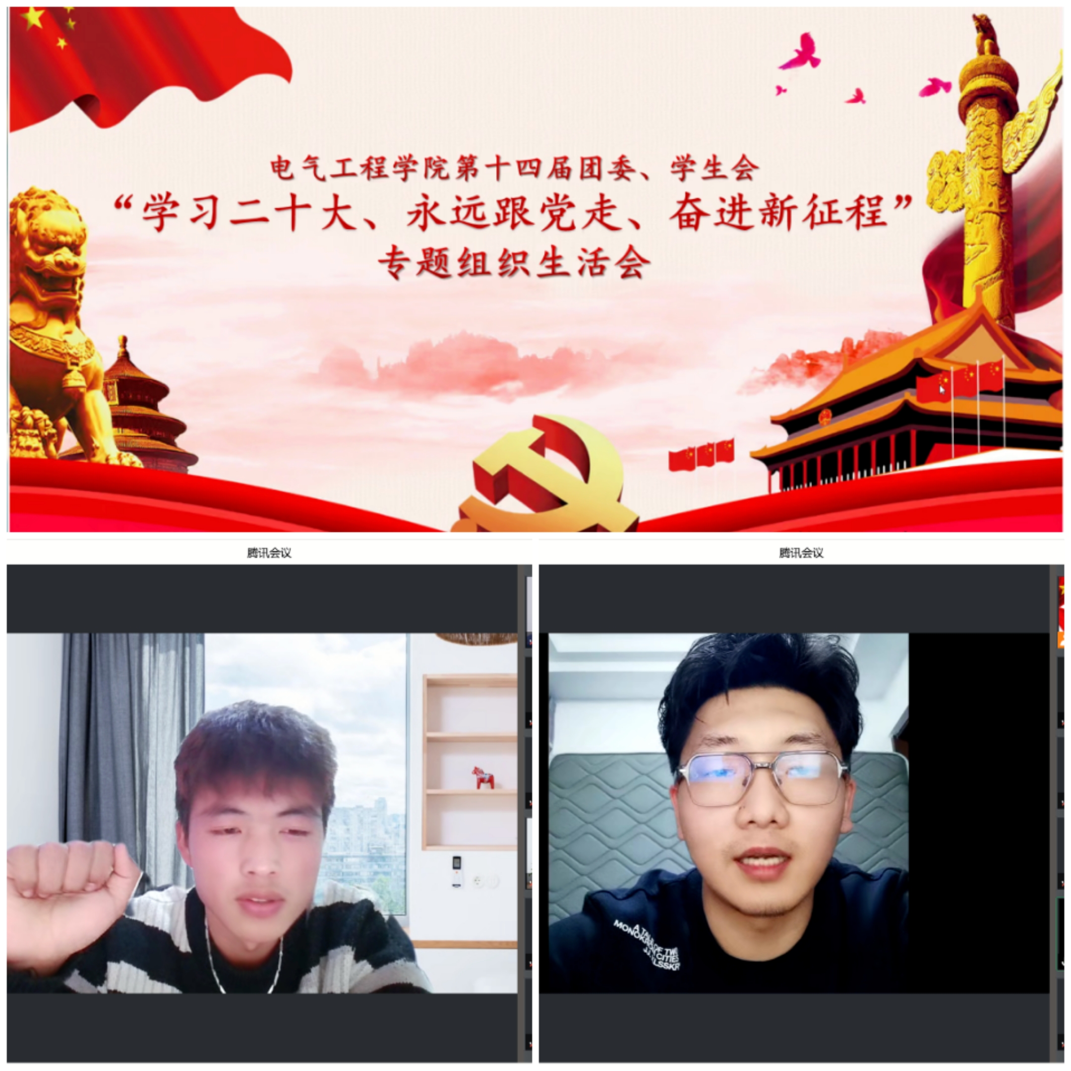 为推动我院团委、学生会更长久的发展,提升学生会干部工作的热忱和质量。2022年12月18日,电气工程学院团委、学生会组织开展了“学习二十大、永远跟党走、奋进新征程”线上专题组织生活会,团委书记李佳衡、主席团成员以及全体学生会干事共计一百余人参加会议。会议由团委副书记牟鑫辉主持。