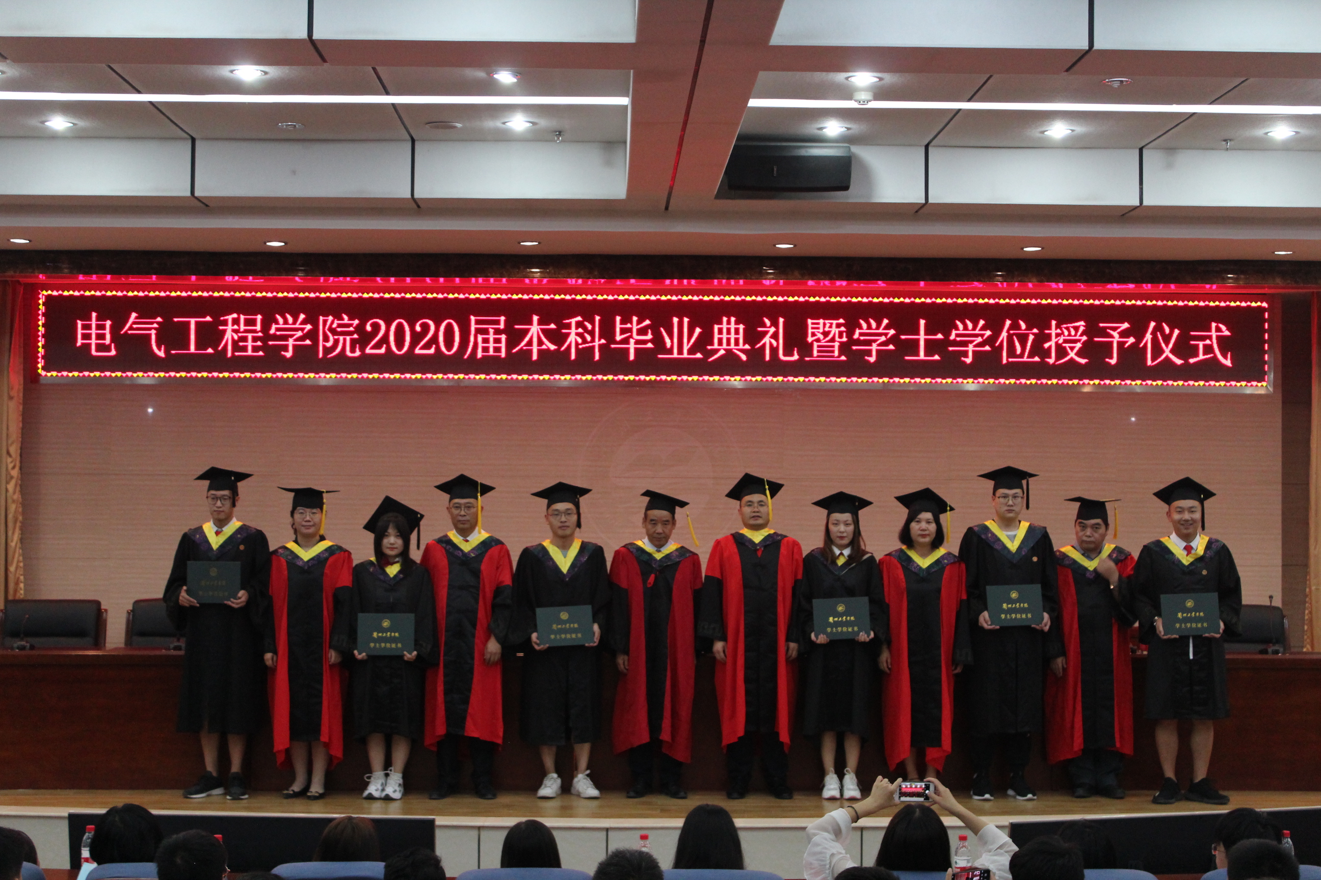 在欢快的进行曲中,学位学位评定分委会委员依次为电气工程学院2020届科毕业生颁发学位证书、拨苏正冠。