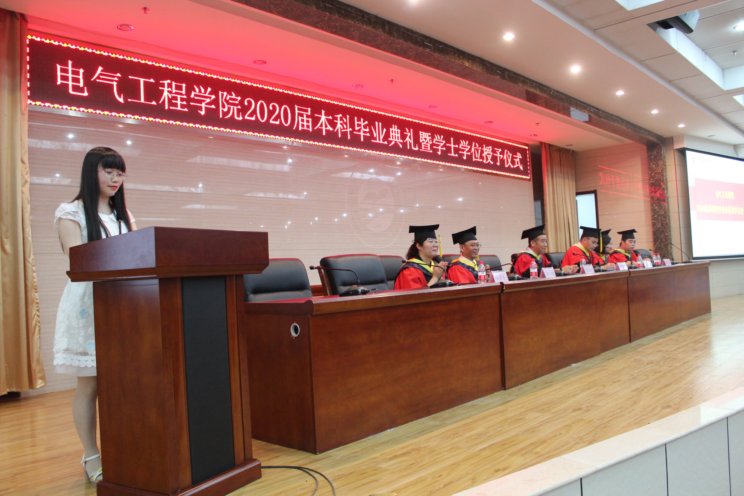 随着雄壮激昂的国歌响起,毕业典礼开始。王淑红宣读了《关于表彰2020届优秀毕业生的决定》《电气工程学院学位评定委员会关于授予任广宏等247名本科毕业生学士学位的决定》。