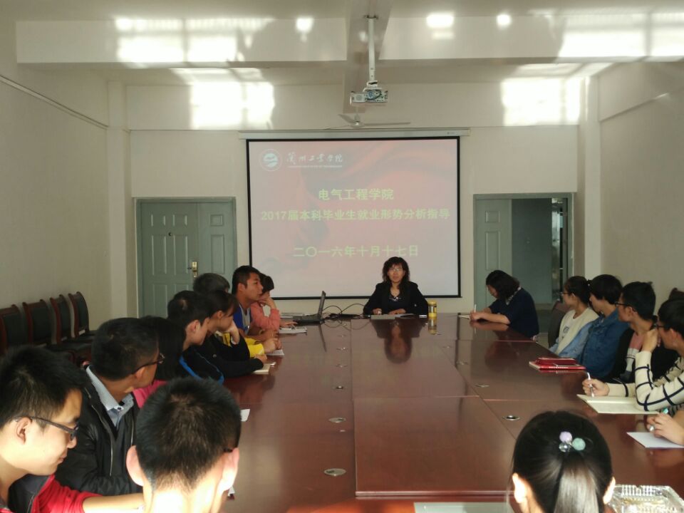 2016年10月17日下午,电气工程学院举办了2017届本科毕业生就业形势分析指导会。副院长张维玲,学工办主任牛玉婷、13级辅导员赵娟娟和13级本科生的学生代表参加了会议。