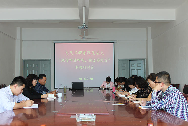 2016年9月20日下午,电气工程学院党总支在学院会议室召开了“践行四讲四有,做合格党员”,“两学一做”学习教育专题研讨会。党总支书记吴安生、副院长王淑红和全体教工党员参加了会议,会议由吴安生主持。