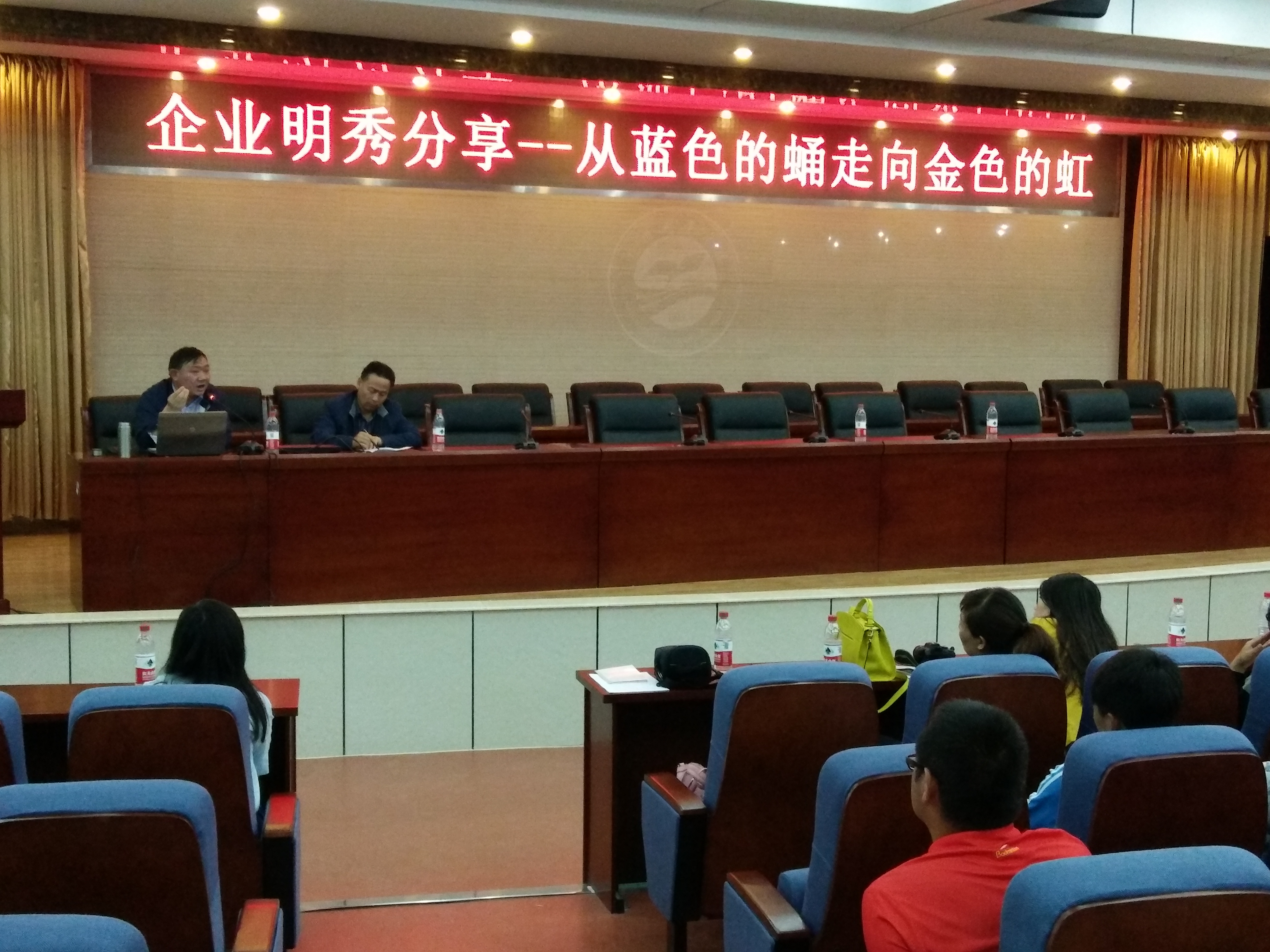 2016年5月17日下午两点,电气工程学院邀请甘肃兴通电力安装工程有限公司总经理、甘肃思创药业有限公司总经理、甘肃兴通农业科技有限公司董事长靳辉来我院进行《从蓝色的蛹到金色的虹》专题讲座。学院党总支书记吴安生、副院长张维玲、学工办主任牛玉婷、辅导员以及13级、14级、15级学生代表听取了此次讲座。