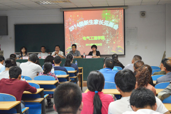 2014年8月28日晚19:00电气工程学院在一教A203成功举办2014级新生家长见面会。党总支书记吴安生、院长李双科、副院长陈金鹏、张维玲、学工办主任牛玉婷及2014级辅导员和班主任参加了会议。会议由牛玉婷主持。